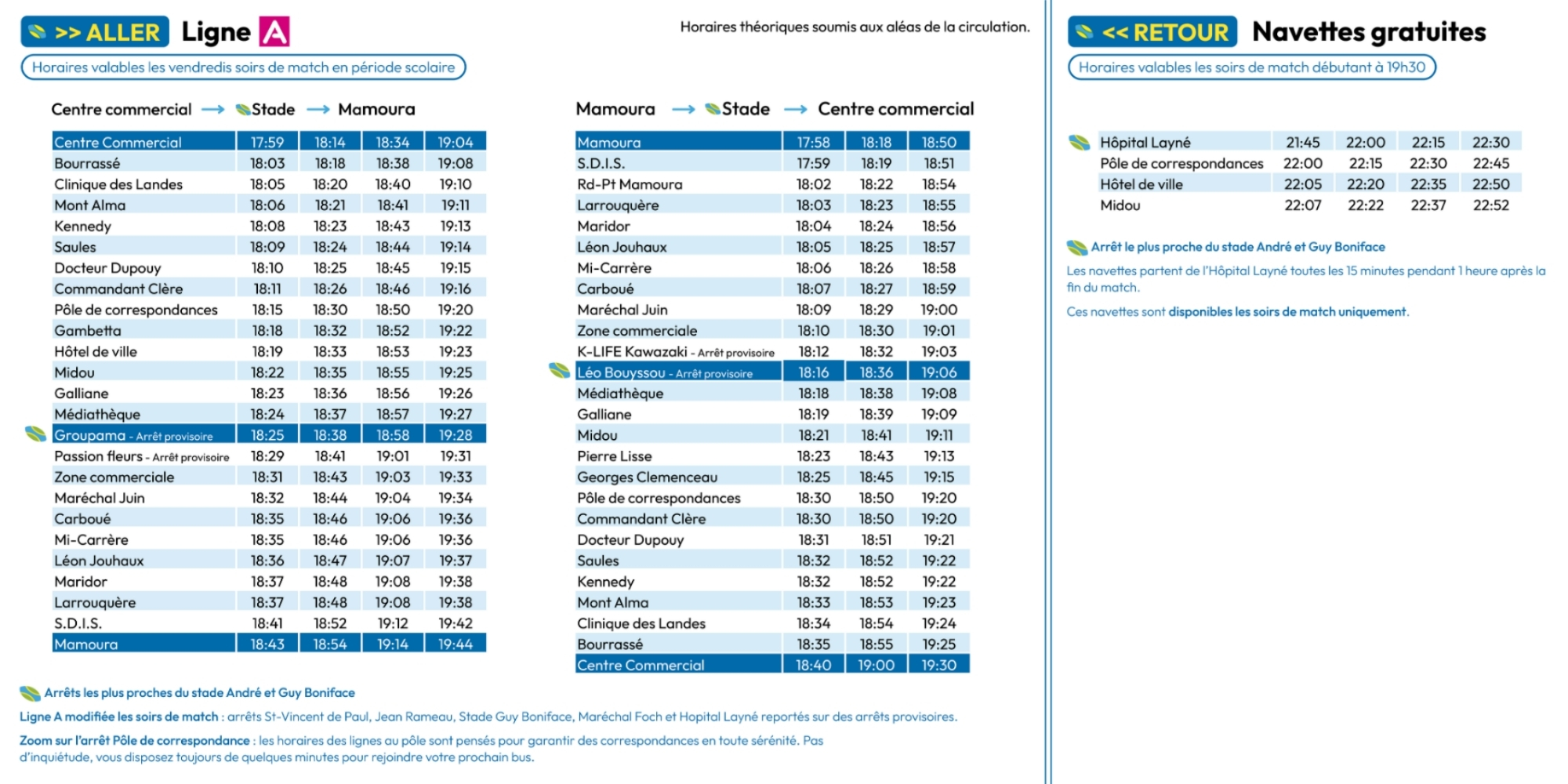 Consultez les itinéraires et horaires des Boni’bus ici : Soir de match, optez pour le Boni’Bus - Stade Montois Rugby - Landes.